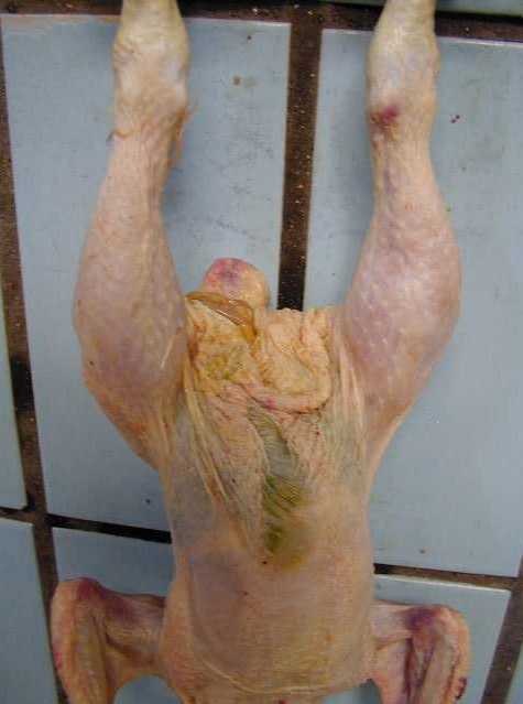 Souillures fécales : s’étendent sur la peau mais aussi la cavité abdominale Souillures biliaires : rares – couleur verdâtre Graisse -> traces luisantes brunes-noirâtres, odeur typique Eau d’échaudage -> la plaie de saignée et les sacs aériens peuvent être souillés ; eau dans les poumons et sacs aériens, avec parfois traînées marron clair consécutives au passage de cette eau souillée |