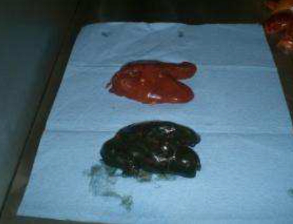 Parfois associée à une carcasse jaune (cf. « Autres anomalies de coloration de la carcasse ») ou une carcasse congestive et/ou de la cachexie. |